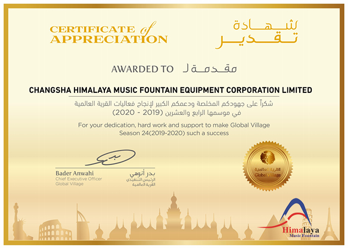 湖南噴泉廠家長(zhǎng)沙喜馬拉雅音樂(lè)噴泉公司成立十年來(lái),一直秉承客戶至上的理念,答客戶之所疑,解客戶之所困,以最優(yōu)質(zhì)的服務(wù)回報(bào)客戶。日前,我公司收到了一份來(lái)自海外的感謝信,感謝公司連續(xù)六年來(lái)給迪拜地球村公園給予的大力支持和鼎力協(xié)助,這一封感謝信充分肯定了我公司在海外市場(chǎng)極高的企業(yè)信譽(yù)和過(guò)硬的工程質(zhì)量。