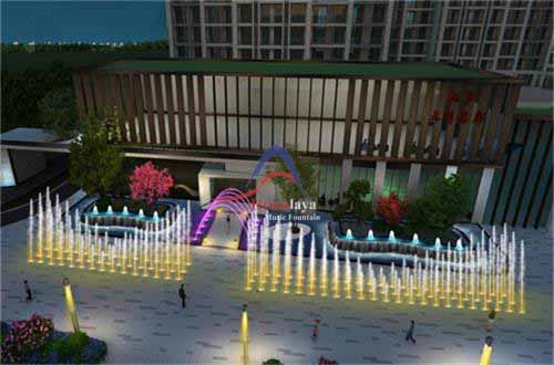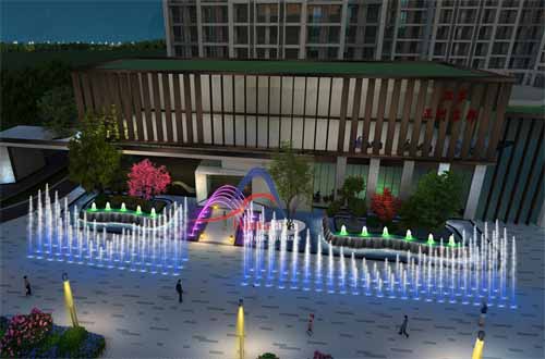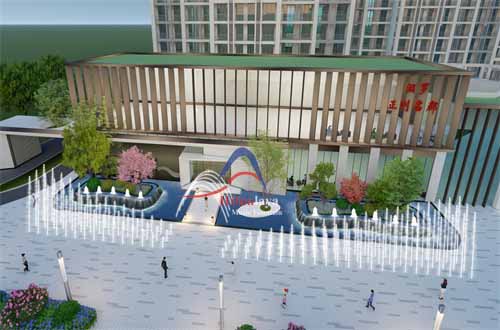 正則名郡廣場音樂噴泉是典型的旱噴矩陣噴泉設(shè)計,由238個DN25直流噴頭組成長方形矩陣。