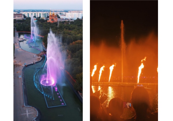 噴泉的表演融合了水、光、火、音效和激光等多重元素,創(chuàng)造出一場(chǎng)立體的視覺和聽覺盛宴。激光和水流的完美結(jié)合,使得水流在夜晚的燈光下呈現(xiàn)出漂浮的效果。配合著音樂的節(jié)奏,水柱、火焰和激光同步起舞,呈現(xiàn)出動(dòng)態(tài)的藝術(shù)畫面。隨著音樂的高低起伏,噴泉的水流高度、噴射方向、激光光束的顏色與火焰的明暗變化完美契合,讓觀眾沉浸在如夢(mèng)似幻的場(chǎng)景中。