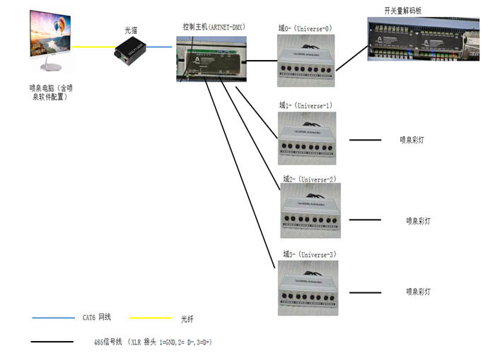 噴泉主機(jī)是噴泉控制的“大腦”本身就是一臺潛入式系統(tǒng)的工控機(jī); 接收噴泉軟件的控制指令,轉(zhuǎn)換成DMX指令給下層單片機(jī)。(工作原理如下圖)