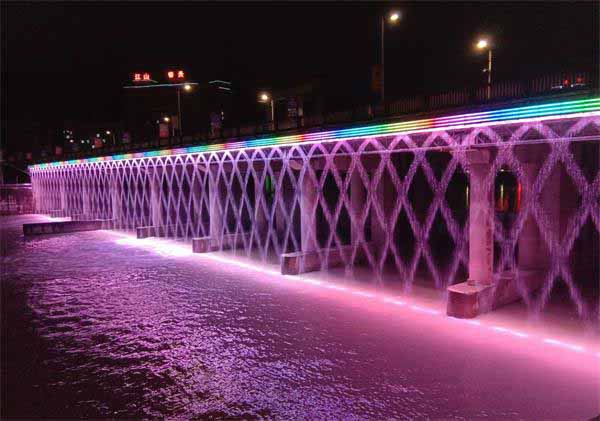 數(shù)控水簾噴泉可以通過電磁閥的啟動關(guān)閉,形成動態(tài)文字或者圖案,以達(dá)到圖文顯示效果的水幕技術(shù)完全顛覆了以往人們對于音樂噴泉和水景燈的概念。