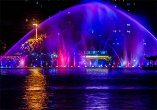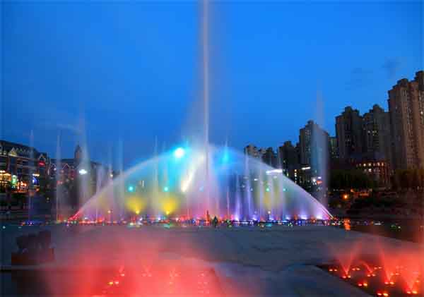 音樂(lè)噴泉的水上布光可以用一些在游樂(lè)場(chǎng)或者建筑燈光中的常用泛光、閃光燈具。