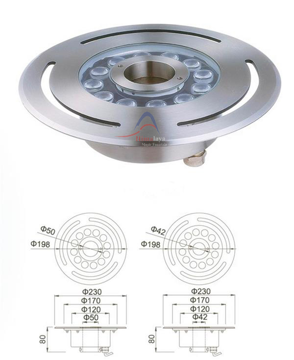 LED水下彩燈有三種常用款式:旱噴燈、中孔噴泉燈和普通噴泉燈。旱噴燈是為旱噴設(shè)計(jì)使用的,采用臺(tái)階玻璃,開孔尺寸為220MM-200MM;中孔噴泉燈是根據(jù)噴頭型號(hào)中間設(shè)計(jì)開孔的,開孔尺寸可以為DN25/DN40兩種款式,一般用于跑泉水型;普通噴泉燈是最常用的一種,采用抱箍或燈架設(shè)計(jì)焊接在噴頭周圍。